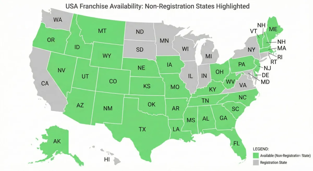 Most states are still open for new franchise partners. The map shows current availability across the US. Green states are open, gray states have registration requirements we'll handle together.